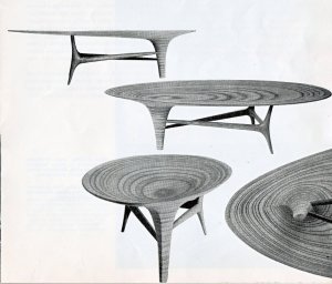 Aeroplane veneer tables/sculptures by Tapio Wirkkala.There is actually a newly launched reissue of the 1958 table. Price: 9500 € – ouch.