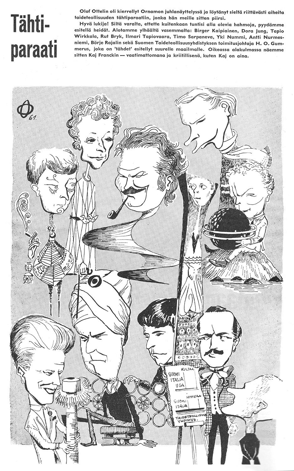 Here’s a great example containing caricatures of Olavi Hänninen, Antti Nurmesniemi, Ilmari Tapiovaara, Carl-Gustaf Hiort af Ornäs and one of himself.