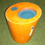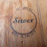 Servex made teak veneer trash cans, bowls, ice buckets and coasters around the 1950s and one designer named is Martin Åberg. The company also went by the name Rainbow Wood Products Inc. Curiously, Swedish brand Carlsson speakers were fitted in the trash can.