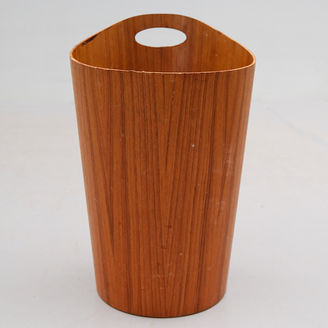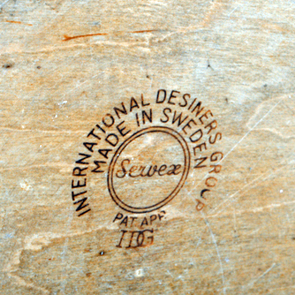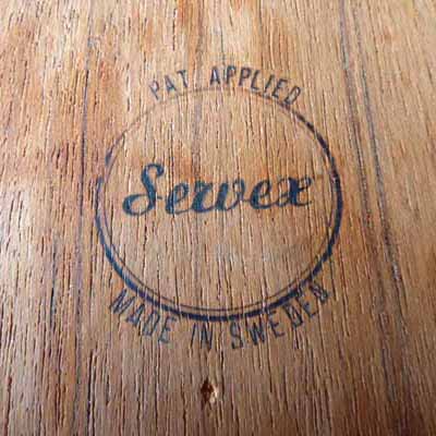 Servex made teak veneer trash cans, bowls, ice buckets and coasters around the 1950s and one designer named is Martin Åberg. The company also went by the name Rainbow Wood Products Inc. Curiously, Swedish brand Carlsson speakers were fitted in the trash can.