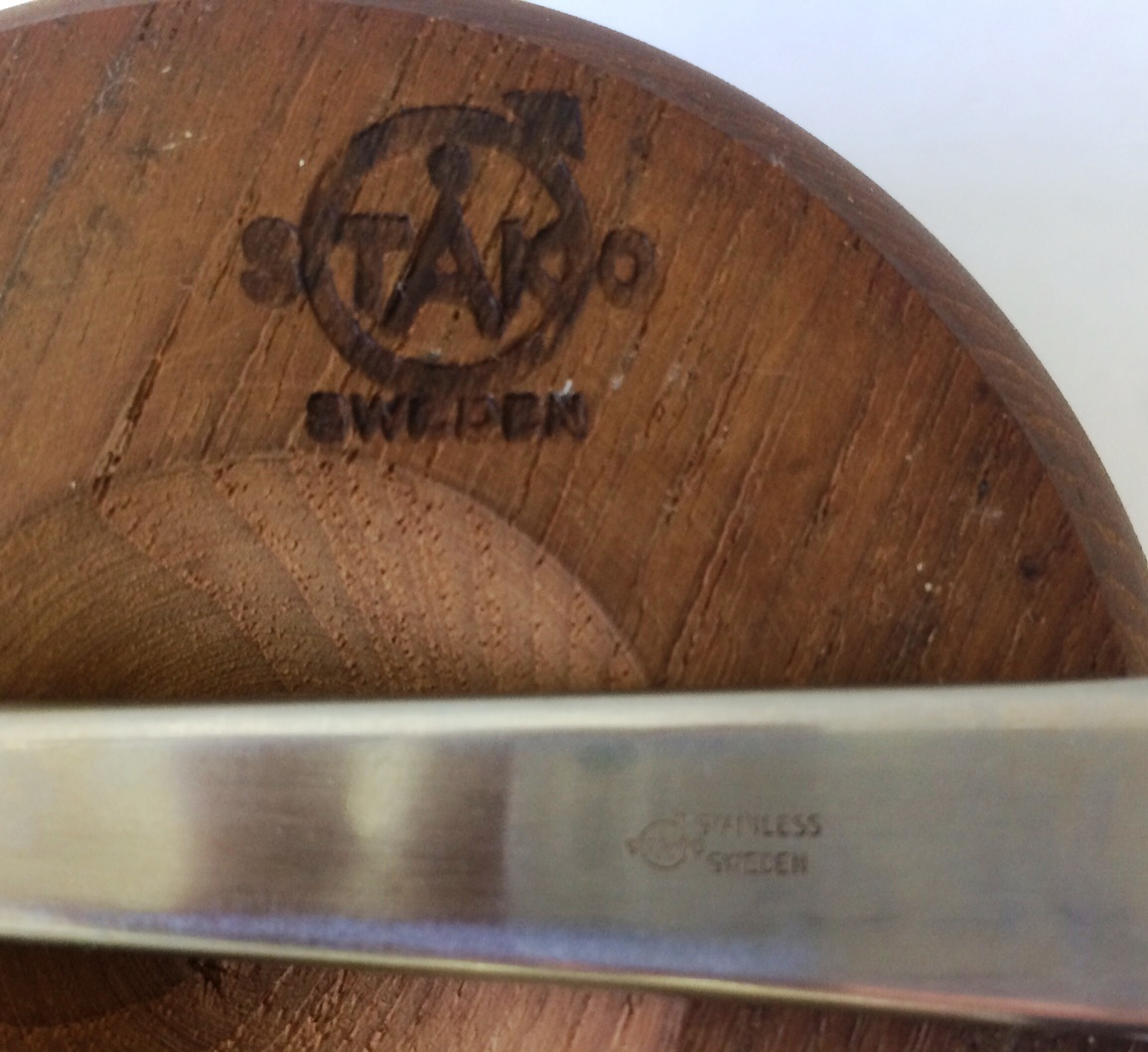 Ståko (StålKompaniet / The Steel Company) was a Stockholm based company making and importing kitchenware, home supplies and decorative items. One of their most famous designs is their range of cutlery clad with teak on one side. Their teak bowls are often accompanied by some sort of metal and all items are marked Ståko. The company was closed down in the end of the 1970s.