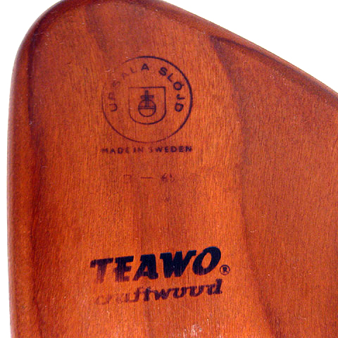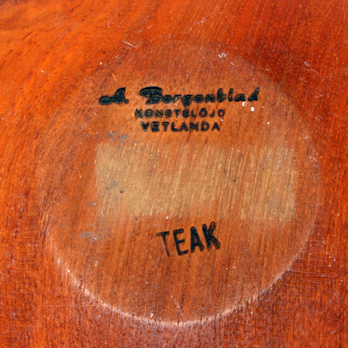 Karl Holmberg in Götene would in time become Scandinavia’s largest company making teak objects and had close to 100 employees by the mid 1960s. Teak however quickly feel out of fashion in the end of the 1960s and even trials with stained wooden items were made. The company couldn’t adapt and went bankrupt in 1973. Items by Karl Holmberg in Götene are recognized by a burned stamp or sticker.