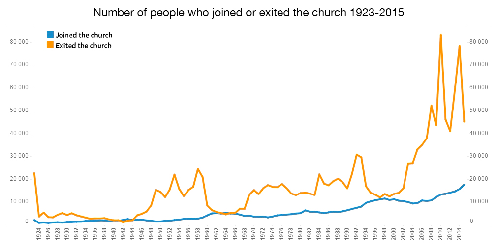 For the church, the costs for getting new members has historically been very low as most people up until a few decades ago, registered their children after birth and the system took it from there. It has been possible to leave the Evangelical-Lutheran Church since 1923 but starting in 2003 exiting was made much easier. The chart below tells much of the story.