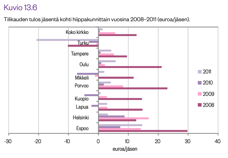 About 80% of the parishes’ revenue comes from taxes and about 70 percentage points of that is tax from church members, with the remaining 10% being earmarked corporate tax. The church owns a significant amount of real estate and forests, as well as other investments, which to an extent helps its burn rate and will carry the church as the number of members continues to drop. The church concludes on page 344 of its 2011 report: