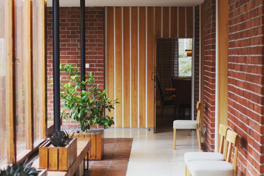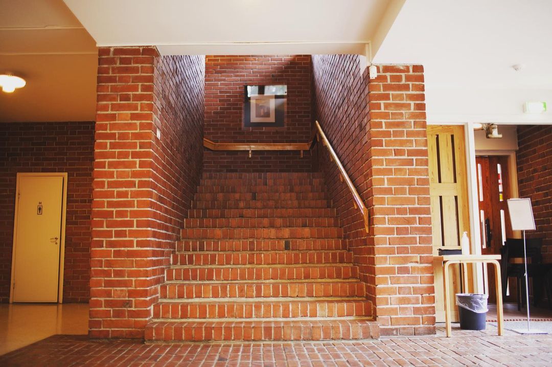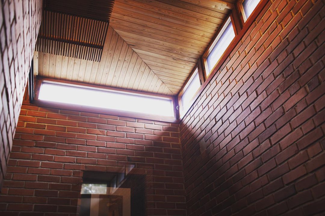 The town hall is crowned by the council chamber, a double-height space which is capped by the Aalto-designed “Butterfly” trusses. The massive brick structure is punctuated by periods of vertical striation in the form of timber columns which evoke Säynätsalo’s setting in a heavily forested area. Aalto insisted that the bricks should not be laid precisely to the plane and that 20% should be off a second rate quality.